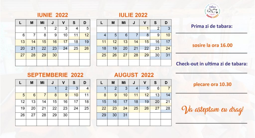 Basketball, Atletism, Inot, Voleyball, Fitness, Dans, Karate/Judo, Tir cu arcul, Ultimate Frisbee. Meditatie, Yoga, Work-shop-uri despre un stil de viata sanatos, drumetii optionale. Seara de carnaval, Foc de tabara, Karaoke, Photo hunt, Video projects, Competitii pe echipe, water games.